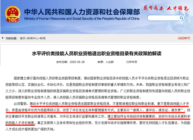 根据政府“放管服”和对技能人员评价制度进行深度改革的要求,2020年人社部发布《关于做好水平评价类技能人员职业资格退出目录有关工作的通知》,公布将于2020年12月31日前将水平评价类技能人员职业资格分批有序退出目录。然而,人社部同时一再强调,推动水平评价类技能人员职业资格退出国家职业资格目录,不是取消相应职业和职业标准,更不是取消技能人才评价。只是由资格评价改为技能等级认定,改变了评价发证主体和管理服务方式,实行“谁用人、谁评价、谁发证、谁负责”,真正发挥用人主体作用和社会组织作用,为技能人才成长成才提供更加广阔的天地。