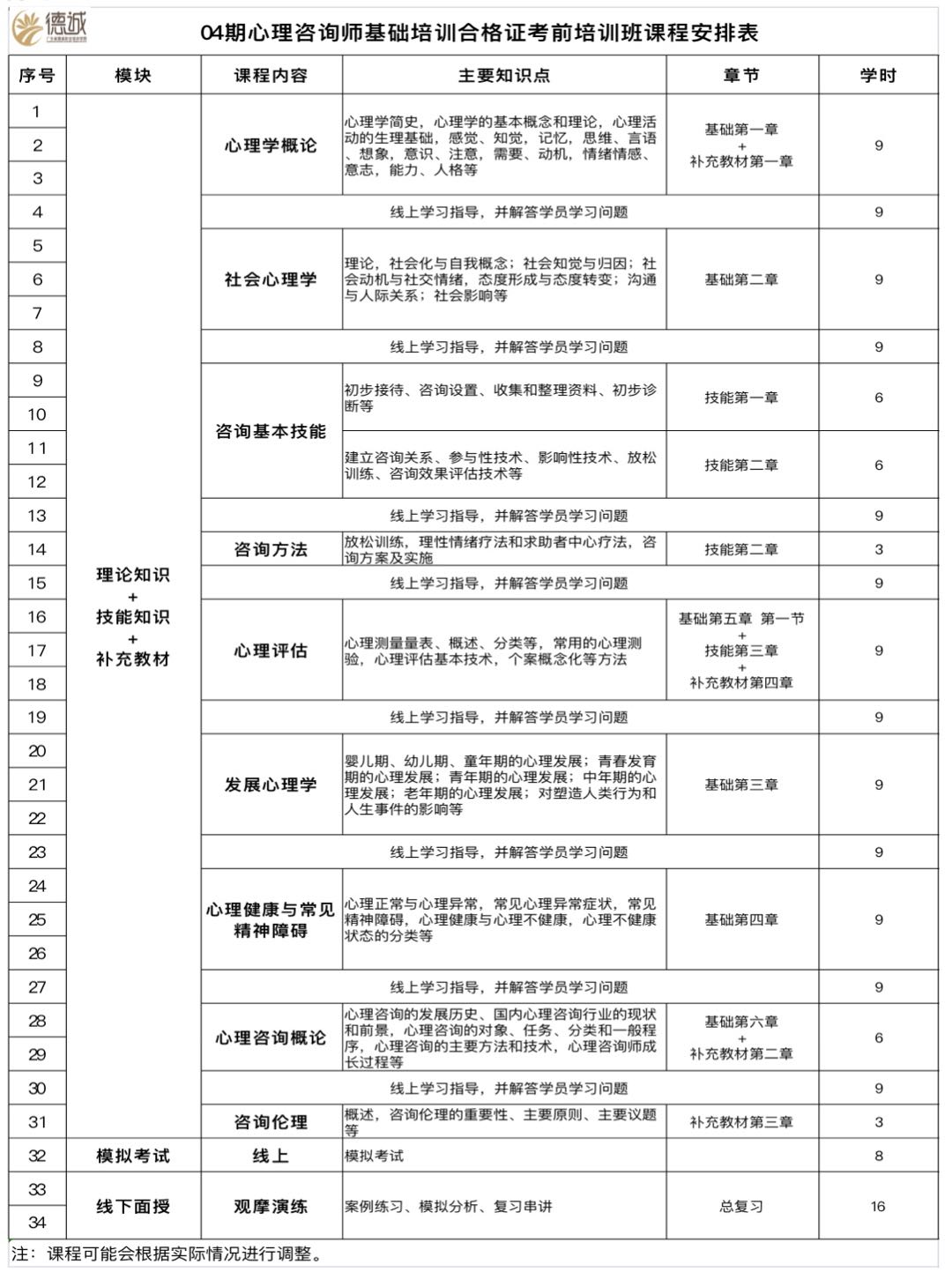 心理学概论(基础心理学)、人格与社会心理学、发展心理学、心理健康与常见精神障碍,心理咨询概论、咨询伦理、心理评估、咨询基本技能、咨询方法、观摩演练、考前辅导等。