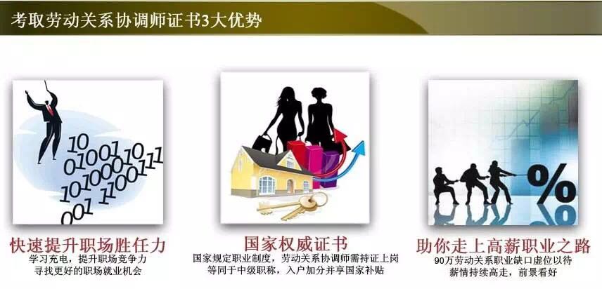 高薪行业的敲门砖,高层职位的垫脚石!优秀的劳动关系协调员收入月薪能达数万元,劳动关系协调员证书的好处:高薪行业+职位晋升。