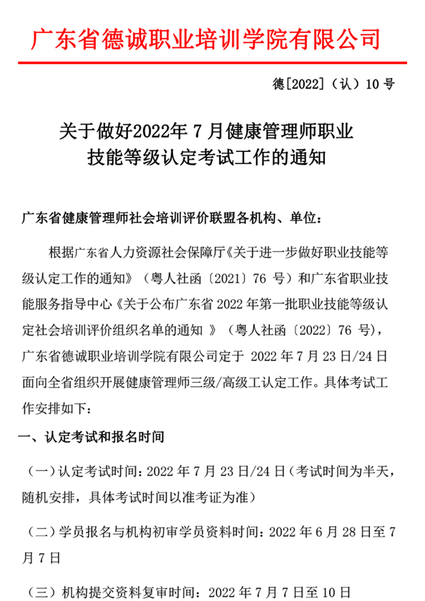 关于做好2022年7月健康管理师职业技能等级认定考试工作的通知