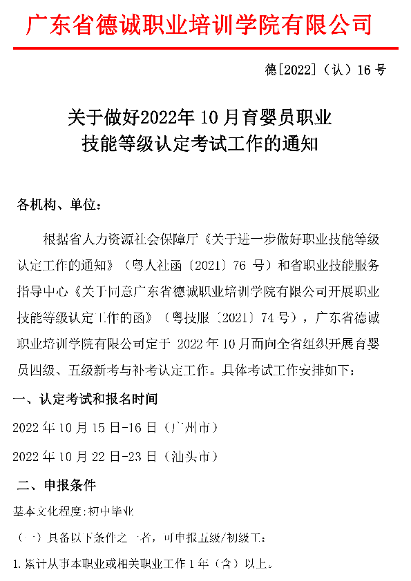 关于做好 2022年10月育婴员职业技能等级认定考试工作的通知